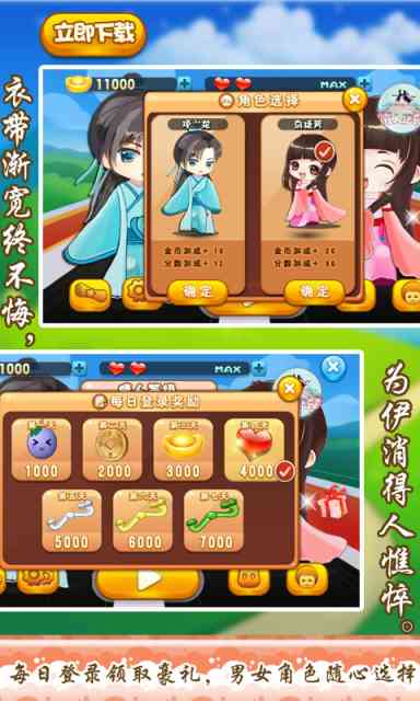 1、 游戏通过操作人物跑到终点,与情人相聚为目的,在跑的过程中, 有啥说啥... 要躲避各种障碍物,也可以收集金币来购买道具。