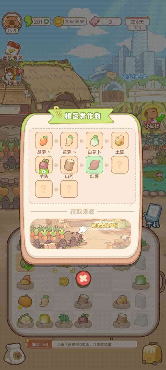 5、 点击成熟的萝卜就可以充当格子里的物品,开垦更多土地去种植,就能合成更多的订单赚到金币。