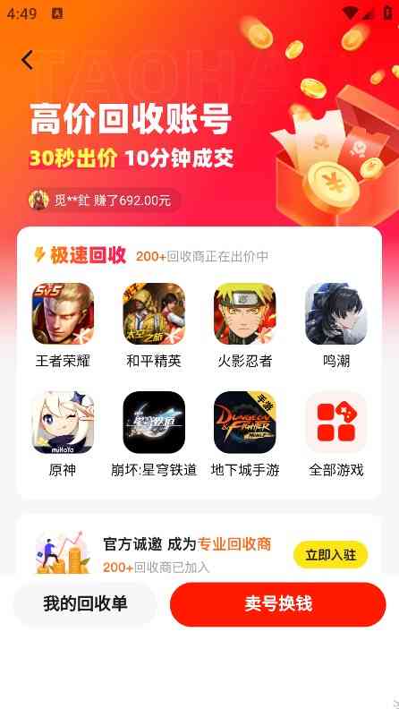 2、账号回收:游戏闲置账号,一键便利回收
