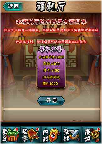 在福利厅中如若有玩家开启了福利, 那么全体军团成员都可以领取福利,抱大腿的时候到啦!