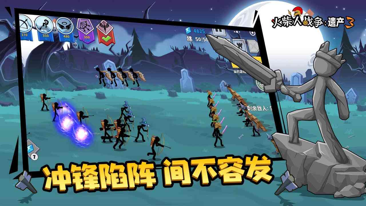 开搞。 火柴人战争遗产3是一款基于火柴人题材的另类塔防手游。游戏中玩家将亲临激烈刺激的战场, 游戏中玩家需要一边需要组建自己的火柴人战队,一边还必须指导他们参加战争,训练并指挥各种具有不同能力的火柴勇士击溃敌人取得站长的胜利。
