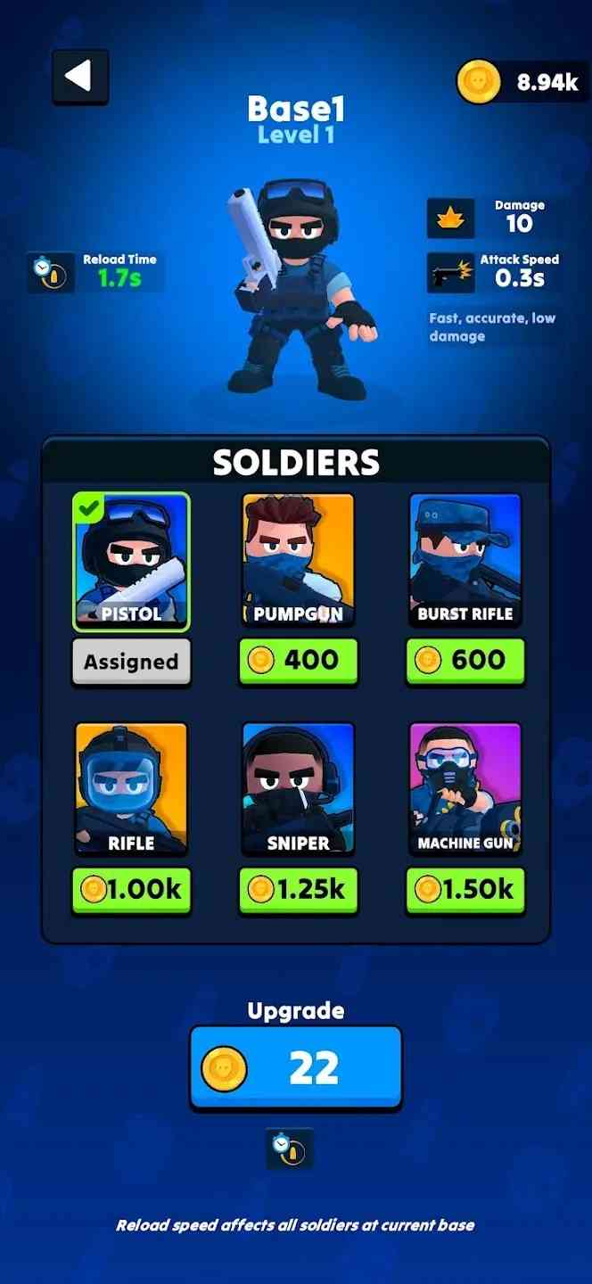 我舒服了。 僵尸已经占领了世界,并试图摧毁每座城市。玩家现在必须解锁基地并购买具有不同武器的士兵, 每种武器都有独特的统计数据,比方说伤害、射击速度和装填速度。