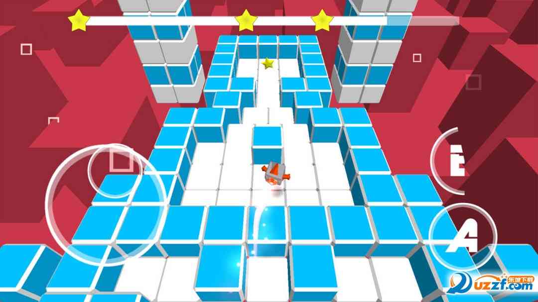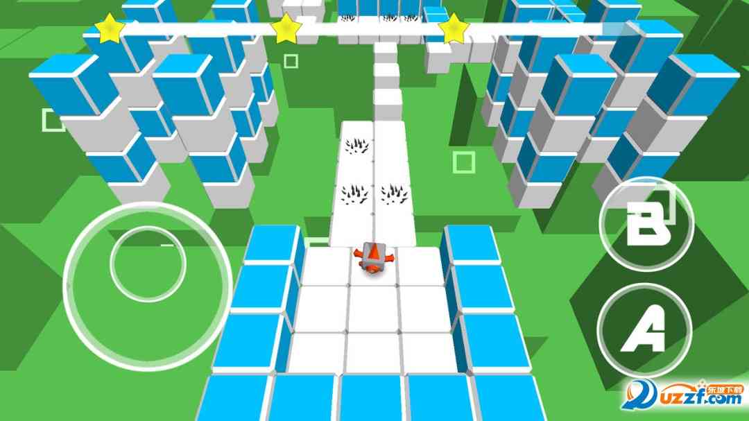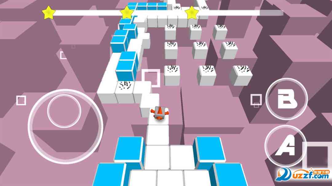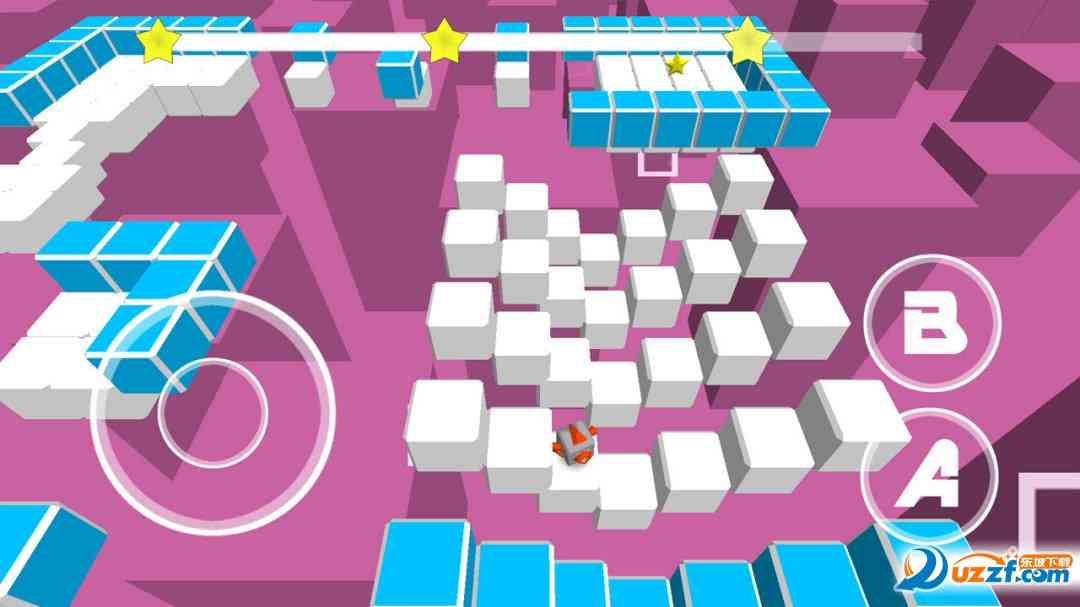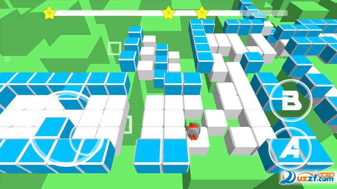 方块风格3D动作游戏, 控制魔方机器人跳过障碍,用最快的速度到达地图上的星星处。屏幕左边的虚拟摇杆控制移动, A键跳跃,B键加速,