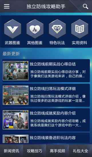 独立防线攻略助手是一款受玩家认可的游戏攻略助手, 它里面主要的内容有:武器图鉴、其他图鉴、特色玩法、实用资料、新闻资讯、攻略技巧、高手视频、礼包大全等8个模块。具有很强的实用性,其内容全面、新颖、准确,相信一定会给大家在游戏中的体验带来很多帮助。