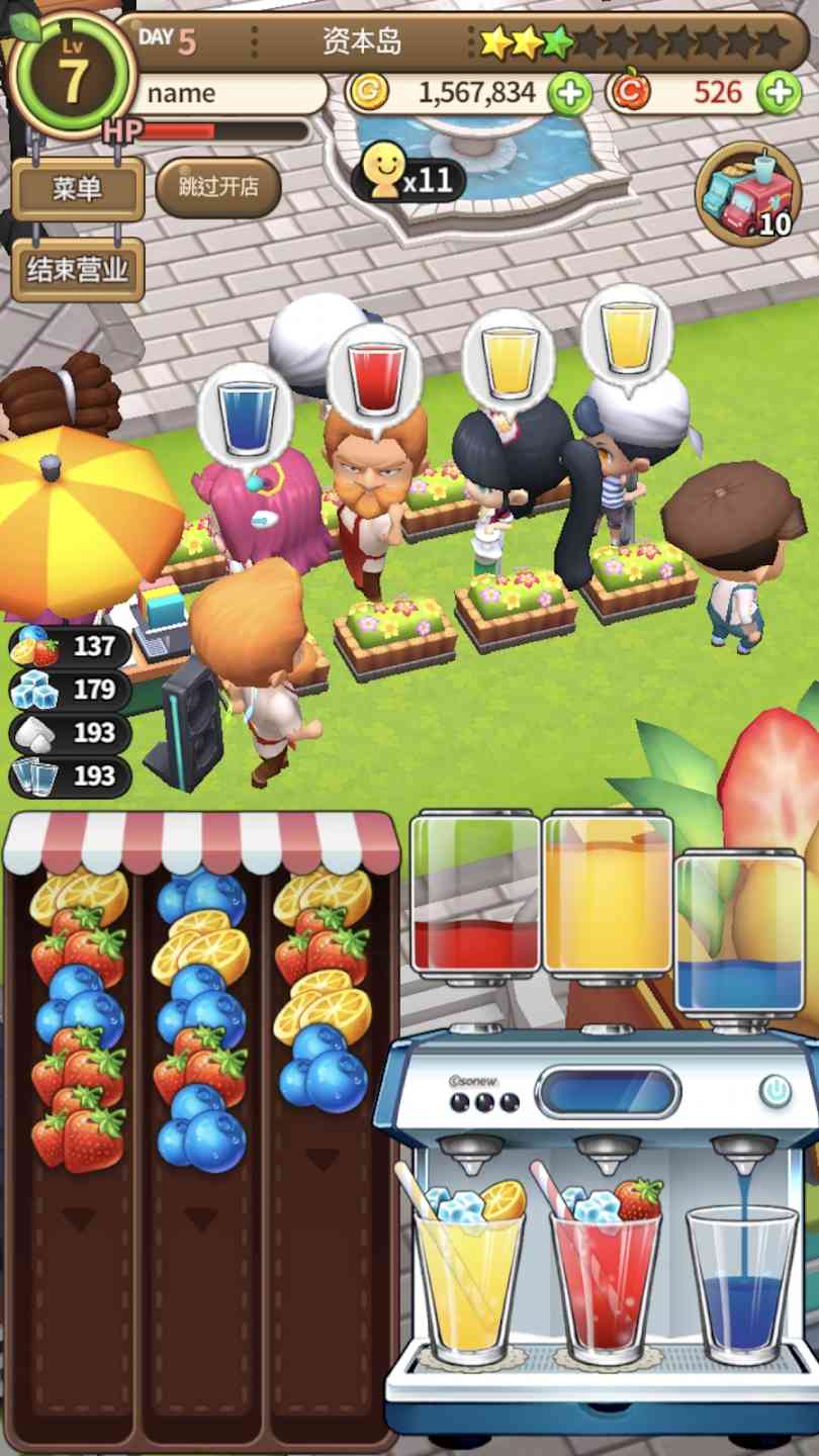 麻了... 从实际的体验来看, 《Fruit Juice Tycoon》略显粗糙的3D画风表现一般,虽然没到不堪入目的水平,却也令人稍感不适。在玩法方面 进行了融合性的尝试,原本以为是直接上手经营店铺,但主要原因是其中加入了大量的故事剧情,设计了角色在岛屿中行走,与其他NPC互动的内容,为游戏增添了角色扮演的元素。在经营店铺时更是巧妙的加入了三消玩法,增加了游戏的难度,对玩家提出了更高的要求。