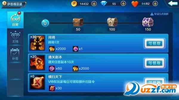 日常任务是每天必做的任务, 是玩家升级经验的主要来源之地,其重要性可见一斑。日常任务包括通关10次副本、 通关3次精英副本、升级3次英雄技能、求贤或拜将5次、典当1次钻石、 别怕... 完成3次奇遇事件、参与3次南蛮入侵、3次群英会、与好友切磋等,均可获得大量的经验和金币,每日活跃度到达50、100、150还可获得额外的钻石、扫荡令、拜帖等道具哦。