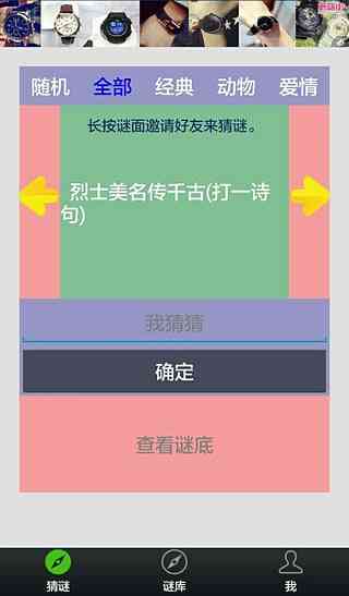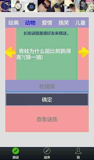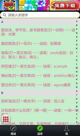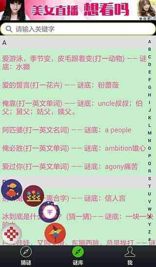 该应用是一款集谜库,猜谜为一体的益智类游戏应用。用户可以快速搜索到想查找的谜语, 不仅有字母排序查找,还有分类查找;该应用还具有猜谜功能和分享功能,你不仅可以自己猜谜语,还可以邀请你的微信和QQ好友一起猜谜语,是不是很有趣呢?哈哈,心动了吗?快下载一个玩玩,划水。。