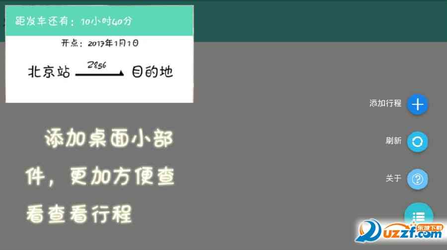 旅行的时候, 当你在车站等车的时候,明明是1月1号00:30的车,可是当你看着时钟在时钟走过一圈又一圈终于变为零点,可是日期却也变成了1月2日会不会很绝望?或许这个软件可以让你避免经历这样的绝望, 不是我唱反调... 进入这个软件,你可以看到你的车票信息,更重要的是你可以看到你距发车时间还有多久,这样,你是不是就不会错过你的车次了呢?