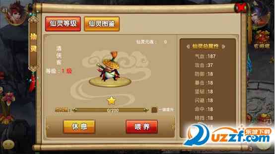 在仙灵等级页面内, 可以看到仙灵到头来的属性加成数据,一边可以对仙灵进行出战/休息,以及喂养的操作。消耗仙灵元魂,喂养到一定成长值,即可提升星级,变成更强大的仙灵啦。
