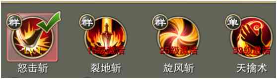 主动技能:怒击斩、 裂地斩、旋风斩、天擒术