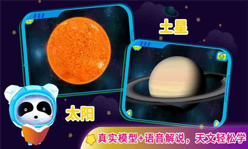 游戏中的语音解说、实体模型,让宝宝们叫出太阳系家族的名字不再是难题。超过百种的互动小知识,让孩子们在游戏中快乐地学习,全面激发他们对天文知识的兴趣,拭目以待。。