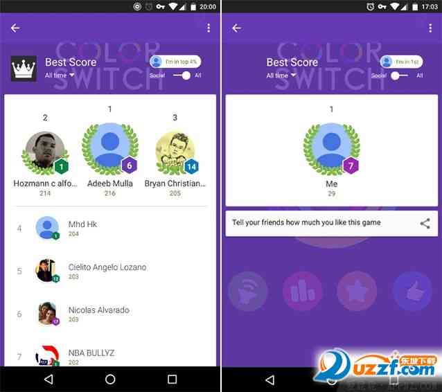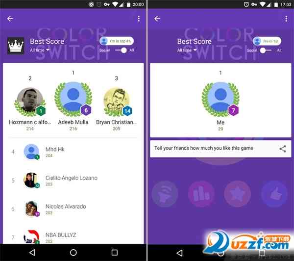 Color Swtich有丰富的游戏舞台, 每一次玩障碍的排列都不尽相同,具有一定的重玩性。当然这类游戏重点还是破纪录, 所以排行榜不能少,包括朋友圈排行榜和全球排行榜,这款游戏截至小编截图时全球最高记录是 216,记录一直在不停的刷新。