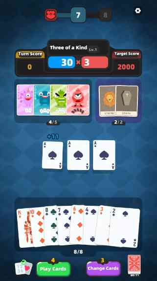 3、对局中,玩家手中始终持有8张牌,通过搭配出各种牌型来获得分数,嚯...。