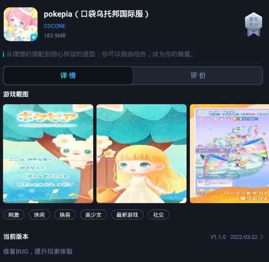 在享受游戏的乐趣时也许你会遇到“口袋乌托邦为什么进不去”的问题。 喜欢什么装扮都可可以换上, 风格没有局限,无论是哪种装扮都可以驾驭。 每完成一章,就会出现一个新的章节,让玩家探索并完成你的职业装扮挑战。 给女孩戴上头饰,配上鞋子,然后让女孩完成游戏中发布的各种任务。 口袋乌托邦进不去,是主要原因是下载的是日服版本,需要加速工具哦。 口袋乌托邦中文版换装玩法 在口袋乌托邦中, 换装玩法多种多样, 喜欢什么装扮都可可以换上,风格没有局限,无论是哪种装扮都可以驾驭。 给女孩戴上头饰,配上鞋子,然后让女孩完成游戏中发布的各种任务。 玩家需要利用手中的服装进行组合搭配,通过服装的搭配让自己成功完成不同的人物。 各种不同的搭配方式带给玩家更多的乐趣,体验最为欢乐的交互聊天。 每完成一章,就会出现一个新的章节,让玩家探索并完成你的职业装扮挑战。 口袋乌托邦全时装解锁 口袋乌托邦中的时装种类繁多, 操作一波。 拥有超过100种动物,具有古怪的个性。 收集全年发生的钓鱼锦标赛和花园活动的主题项目。 根据需要设计露营地,露营车和小屋。 1000多件家具和300件服装及配件可供选择,随时增加更多。 pokepia口袋乌托邦中文版更新日志 我们准备了将来会出现的项目。 还有啊,修复了一些小错误。 有关详细信息,请查看应用程序中的通知。 感谢您一直以来对Pokepia的支持,什么鬼?,简直了。!