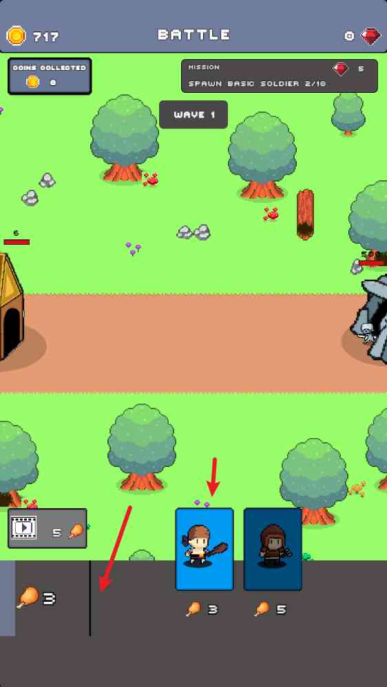 1、 游戏开始后左下角会不断获得食物,以此来召唤战士进行战斗。
