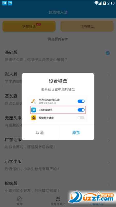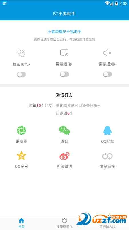 容我插一句... 3. 首页可以选择干扰对象, 可以屏蔽 4. 点开技能框美化,各种技能框任你选,全部免费 5. 输入法则更是无敌了各种怼人输入法 BT王者助手功能 1. 王者荣耀输入法怼人必备神器,全新聊天输入体验; 换言之... 2. 超多样式的王者技能框美化,超酷炫幻的游戏感观; 弄一下... 3. 一键短信 BT王者助手技能框美化类型 绝代智谋_诸葛亮 吸血鬼伯爵_非主流 追梦之光_光效 主播专用版 我打adc 至高创世 鹊仙桥_狗粮必备 水晶猎龙者_花木兰 凤求凰_李白 末日机甲_孙尚香 绝世舞姬_貂蝉 地狱火_孙悟空 暗黑贵公子_鹿晗gif动图 等等... BT王者助手软件特色 1. 王者怼人神器 2. 游戏聊天一键发送, 疯狂怼人不费劲 3. 游戏视频社区 不如... 4. 海量游戏视频随心看,大审操作,娱乐搞笑,游戏同人。 5. 玩家神回复 快速输入,不支,技术差,老投降,聊天不费时间。 相关新闻 换个思路。 先说说不得不说这个辅助真的是神器, 我一边玩游戏一边怼对面的,打字飞快,后来啊他打字的时候被XX了哈哈哈,简直6的不行; 妈妈再也不用担心我玩游戏的时候突然接到短信,还有 我的英雄救世不一样,还有我的皮肤也是非常炫酷,技能释放还是带花的哈哈!