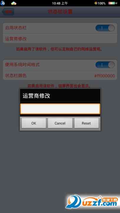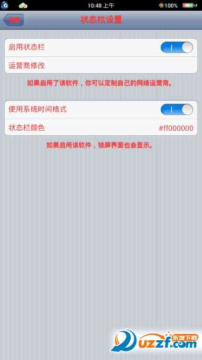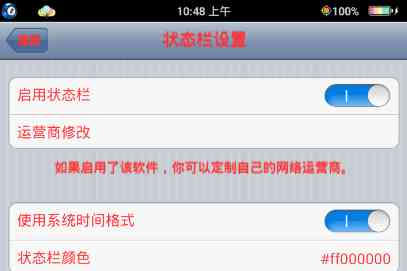 彩虹电池状态栏美化是一款不用换主题就可以换状态栏的软件, 可以修改状态栏颜色+彩虹电池+自行修改的运行商,非常强大,并且简单易用,堪称状态栏美化神器!