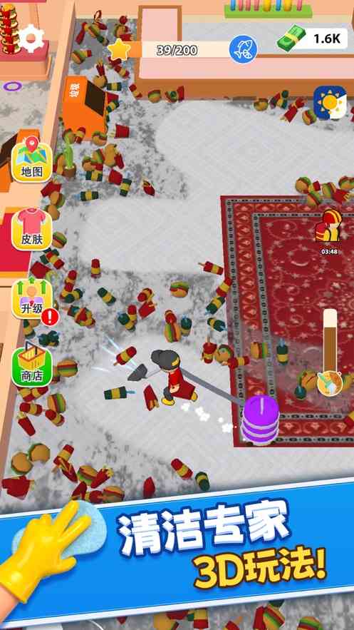 游戏要求玩家清理餐厅的各个区域,包括厨房、用餐区和浴室。玩家必须捡起垃圾、扫地、洗碗等等,以保持餐厅干净、温馨。游戏节奏快且富有挑战性,让玩家在争分夺秒完成每项清洁任务时保持警惕。