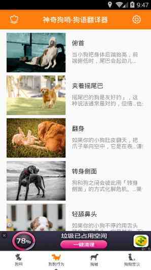 当然 仅仅听懂狗狗的叫声还不够,神奇狗哨狗语翻译器app还能对狗狗的行为进行解读,让你更深入地了解你的爱犬。