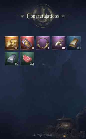 躺平... vikingard0321:300金币、 8张幸运券、1支Gjallarhorn、10块天赋蛇牙碎片、80块铜锭、60块黑铁锭、2,000,000粮食。