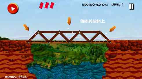 火车正要通过大桥, 你的任务不是让火车平安通过而是在桥上放置炸药,让火车跌落山崖即可过关。游戏是关卡的模式,玩家通过一关后下一关会自动开启。 梳理梳理。 越往后游戏的难度也就越大。玩家要考虑三角定律,破坏掉桥梁的稳定性,这样才能让火车落入山崖。