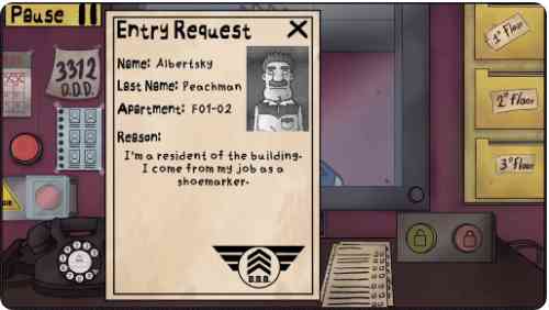 目前的游戏中只有一种游戏模式:街机模式。在这种模式下 你坐在办公室的玻璃窗后面使用任何给定的文件和办公室里的物品仔细检查任何请求进入大楼的人。每次检查,都会有各种各样的人请求进入。只是也会有一大群被称为分身的变形怪物试图冒充这些邻居进入你的公寓,意图谋杀你和你的邻居。你的工作是识别这些分身并阻止他们进入,一边允许真正的邻居进入。每次检查你都必须非常彻底;如果你不小心让分身进来你会在检查结束时被杀死。