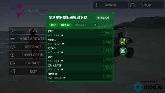 内置地图/车辆模组 地图模组游玩教程: 下载模组之后点击Play。 进入到游戏模式界面选择想玩的模式,点击进入。 点击游戏上方的mods, 即可查看地图模组是否下载成功,然后选择地图,点击Play即可进入地图。 进入地图之后 点mods, 即可查看车辆模组是否下载成功,然后选择车辆, 不忍卒读。 点击Spawm即可开始游玩。 《辛迪车祸模拟器》是一款极具趣味性的汽车驾驶模拟游戏, 游戏画面精美,操作流畅,玩法多样。如果你喜欢刺激的驾驶体验,那么这款游戏绝对不容错过。赶快下载体验吧! 让我们暂时放下疲惫,走进《辛迪车祸模拟器》的世界,感受驾驶的快感吧!