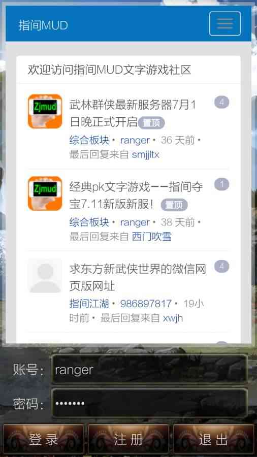 丰富多彩的经典纯文字冒险类游戏社区客户端打造最好玩的文字游戏社区!指间mud主要用于连接登录传统的文字mud服务器, 与电脑上zmud的最大不同就是开放更新了手机触摸操作相关协议,既能让传统的mud巫师方便接入手机端以拥有更多用户, 一句话。 更能让用户更方便的用手机来享受文字类游戏带来的乐趣!目前已有10几个mud站点已经或者正在接入指间mud, 因为更多的类型的站点的接入,相信会给大家带来更多的文字游戏乐趣!