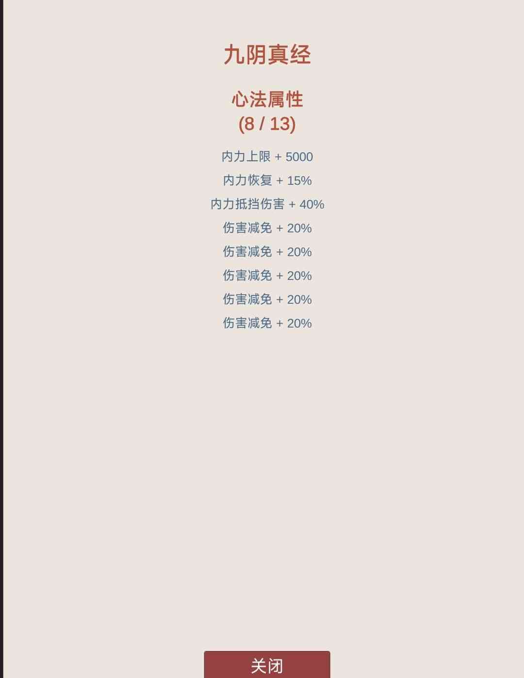 心法最好是九阴真经,没有也无所谓,打满减伤直接无伤通关,白色残页一次能加12%。没有就血量,内力双抗