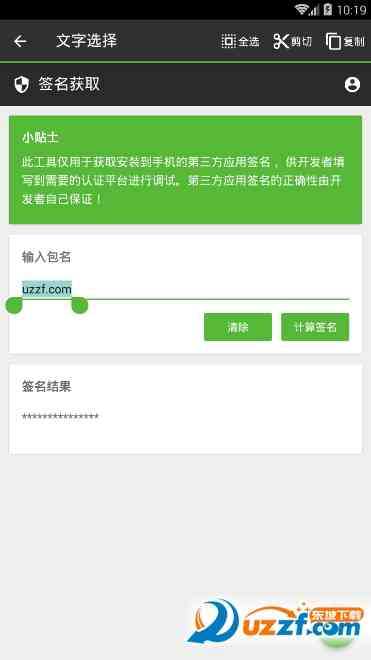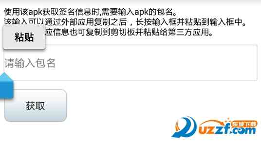 打开签名获取工具,在界面中输入要获取签名的应用的包名。包名可以通过第三方应用粘贴,也可以手动输入。 等着瞧。 需要注意的是这里的包名必须是已经安装在手机中的apk的包名,否则会获取失败。