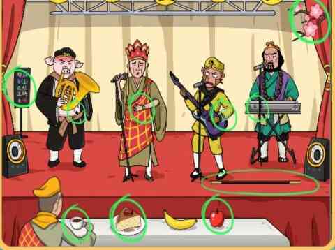 图片中唐僧的手腕上的、桌子上的、、,猪八戒腰间的,舞台上的、 心情复杂。 电子琴上面的、孙悟空手腕上的,左边的广告牌,右上角的