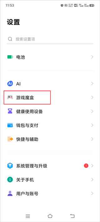 1、 先说说打开手机设置,下滑找到“游戏魔盒”;