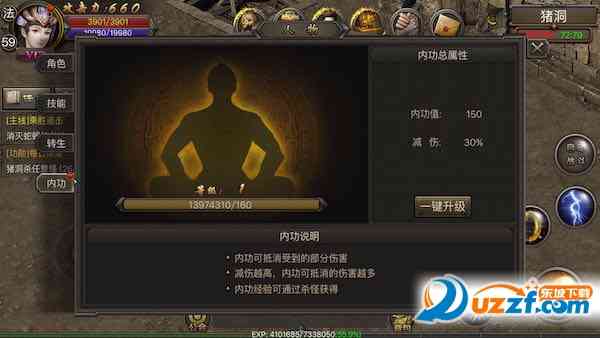 内功经验可一直累积,经验条满后需要手动点击升级按钮进行提升,太暖了。。