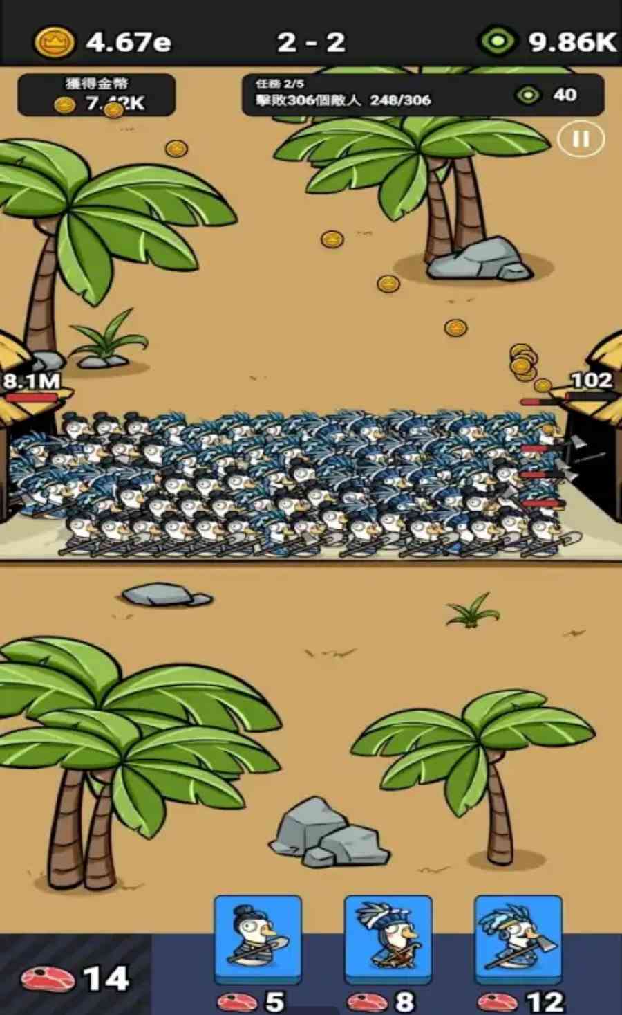 使用食物来召集部队并在战斗中击败敌人!超级脑洞的鹅鸭战士们来了!一起穿越历史,发展吧!