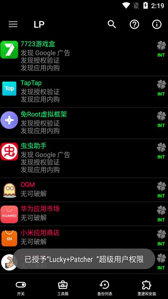 幸运破解器需要root权限以使用全部功能。如果没有root权限,幸运破解器仅能在受限模式下运行。