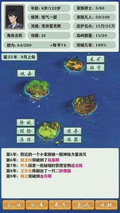 火候不够。 3、 岛屿争霸,家族需要占领岛屿,庇护凡人,既要抵挡来此海洋妖兽的威胁,又要抵御险恶的修真世界中各种势力,在这里你需要小心经营自己的家族,学会合纵连横,尽量让自己的家族存在更久,方能找到机会崛起。