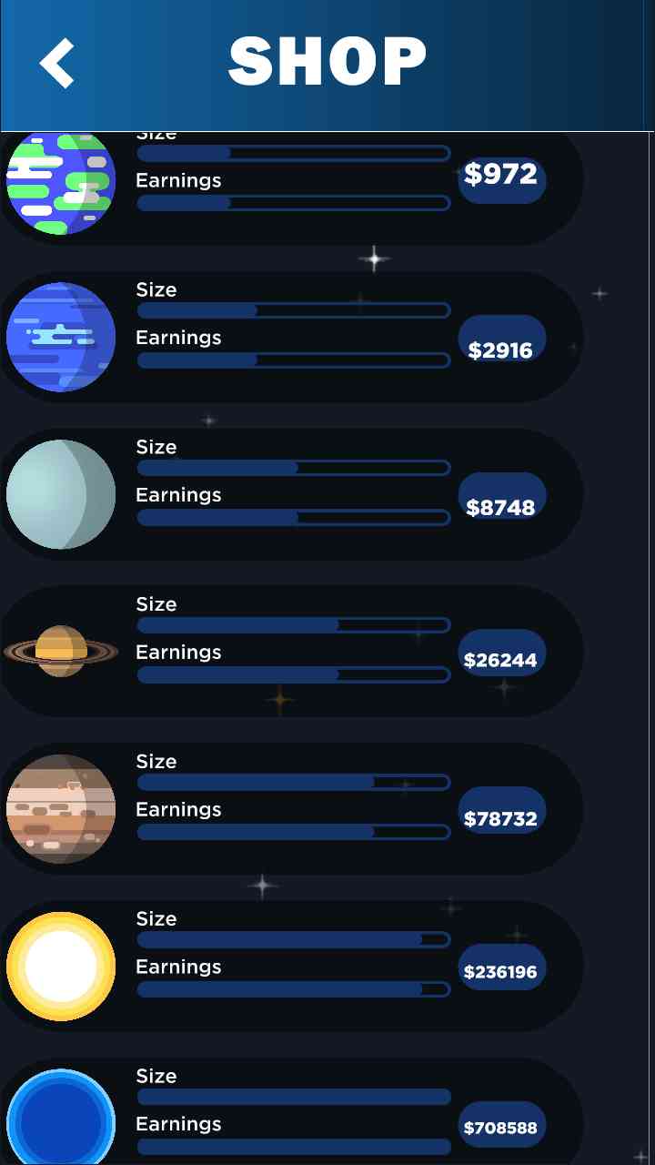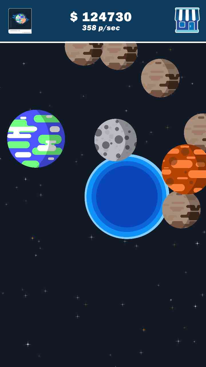 冥王星、月球、水星、火星、金星、地球等等12颗星球,按大小排列,两颗低级星球能合成一颗高级星球,以此类推。每隔两三秒会自动生成一颗星球, 不仅能自动生成,通过商店也可以买哪一种最合适吧。