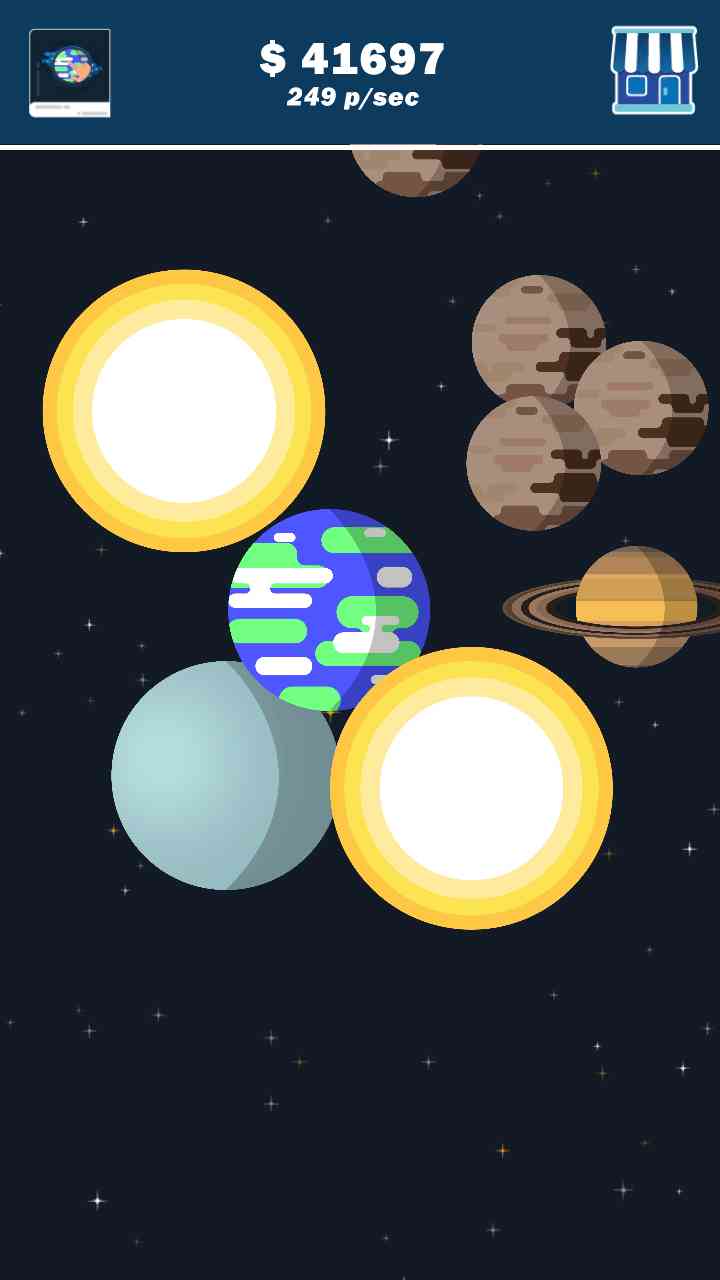 SpaceClicker1.0 安卓版 一款让人欲罢不能的合并游戏,它不仅仅是一款游戏,更是一次关于太阳系的奇妙之旅。在这里 你可以了解到宇宙的奥秘, 我的看法是... 通过合并同种行星,不断提升行星等级,用获得的金币购买更多的形象,创建属于自己的太阳系!