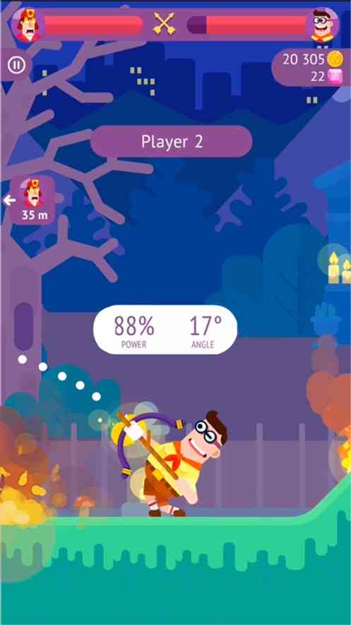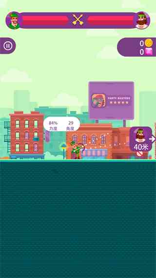 1、玩法就是拉弓箭,玩家可以控制弓箭的力度和角度, 在理。 让弓箭发射出去,准确射到对方的身上。