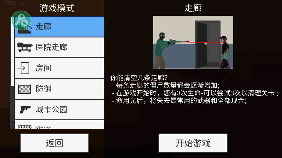 射杀僵尸防御游戏已汉化破解, 进入游戏设置可更改语言模式,几种语言相互切换,游戏模式非常的丰富,不同的场景之中,僵尸数量也会不同,每一关都有三次生命,使用手中的武器消灭全部的僵尸。