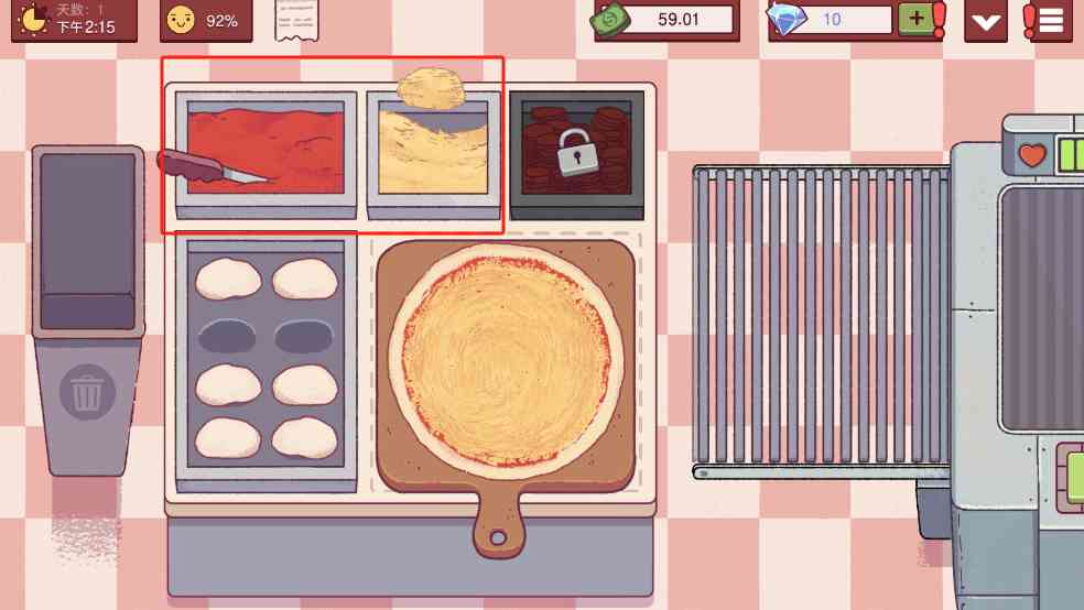 3.完成披萨制作顾客带走后你就会赚取到收益,这些金钱可以让你研究出更多种类的披萨,欧了!。