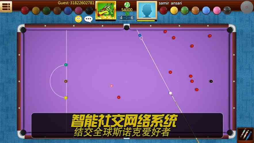 辅助瞄准线:提供清晰的虚拟辅助线, 帮助玩家预判主球撞击目标球后的行进路线以及目标球的吃库反弹路线, 换言之... 极大降低了上手门槛。