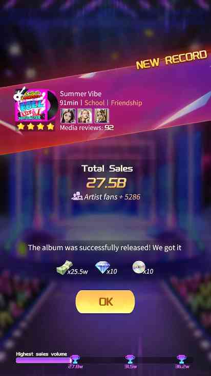 2.《Rise of Belles》的另一个主要功能是可以为女孩定制单曲并出售它们来赚钱。玩家可以与女孩们一起创作独特且引人入胜的音乐单曲,并根据女孩们的个人风格和喜好进行定制。单曲制作完成后玩家可以将其推销给粉丝,从而赚取金钱并在行业中建立声誉。