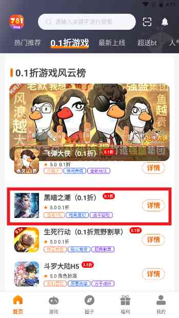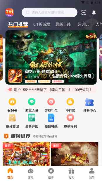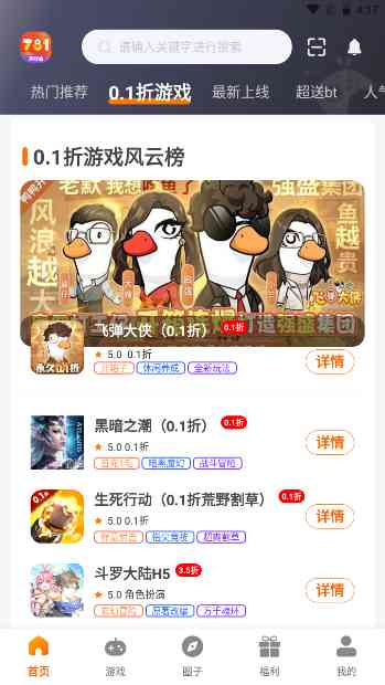 781游戏盒子是一款专门为大家准备的福利游戏盒子, 这里的每一款游戏都有海量福利礼包相送,不管是策略、动作、闯关、休闲、格斗等游戏类型,这里都有,每天还有新游戏上线,满足不同玩家的不同喜好,丰厚奖励帮助玩家直接跳过新手阶段,已进入游戏就是大神玩家,如果你是一名游戏爱好者,那就快来本页面下载安装781游戏吧,弯道超车。。