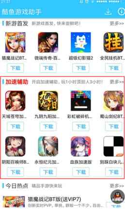 1、酷鱼游戏助手提供大量个性化游戏下载!盒子里有许多加速版、变态版、破解版、满V版精品游戏!!