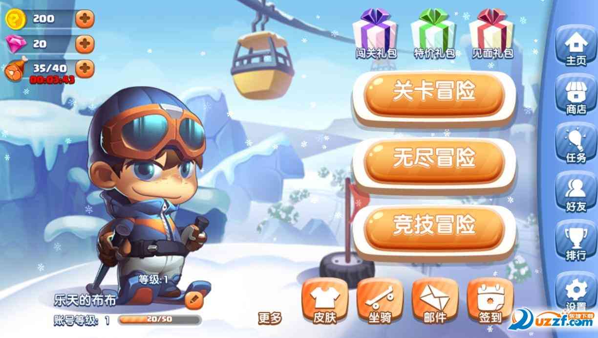 融合了很多游戏元素的跑酷游戏。其游戏模式类似天天酷跑,人物在滑雪时使用2段跳和短距离滑行来收集钱币和星星,并且躲避障碍物。集满能量后有快速冲刺。真的和天天酷跑很像,但是这是靠完成关卡的游戏,有体力值,完成关卡有开箱功能,挺好。。