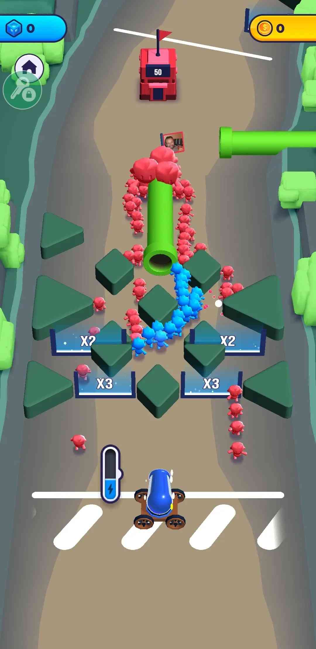 请大家务必... 《炮弹人冲冲冲》是一款非常好玩的策略闯关游戏, 玩家控制着炮台,释放炮弹兵,在经过倍数门的时候会增加炮弹兵的个数,我们不断地壮大炮弹兵的队伍来抵御地方炮弹兵的攻击,只要我们在规定的人数到达敌方的大本营,就可以获取游戏的胜利,小伙伴们快去占领对面的基地吧。