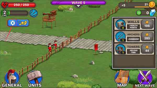 结果你猜怎么着? 升级城墙可以增加城墙的血量,敌人就更难突破你的防线,升级弓箭手可以增加防御伤害;升级塔楼和投石机可以加快箭楼和投石机的射速。