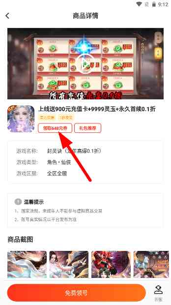 2、 点击游戏,进入商品详情界面如下图所示,然后点击“领取648元券”,探探路。。