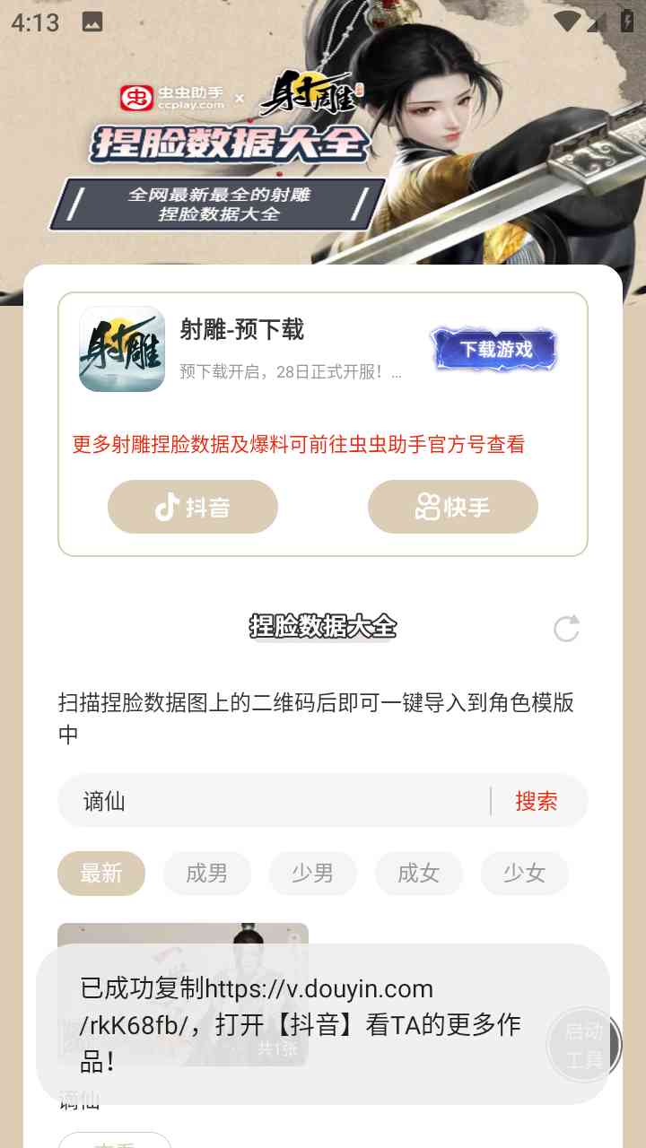 虫虫助手射雕捏脸数据大全集合了射雕游戏手游各种捏脸数据供你选择, 平台为您提供的服装,配饰的材质会不时更新,风格多样,一键导出,捏脸,配衣服完成后即可一键保存生成的图片。